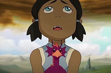 The Spirit World is a lush valley, with rich, almost neon colors and every form. Korra and Jinora start out together, but get separated twice. The first time, Jinora scampers off after some cute spirit, and Korra nearly gets in a brawl with prairie dogs, finding out the hard way she has no bending powers here and angering the spirits even more. Jinora manages to intervene with them, reminding Korra that her own emotions can cause trouble with the spirits, so getting angry with them will only make them fight. When they are separated again after tumbling through a forest, a giant alligator's mouth, and river rapids, we see Korra in a forest, transformed into her younger self, maybe aged five or six. The implication is clear: Korra's fear in the spirit world has transformed her into a child. She is startled by evil looking spirits constantly. She accidentally injures a baby dragonbird that startles her, but feels pity for it and carries it through the forest, fearfully calling out for Jinora. Instead, she and her dragonbird baby hear a gentle, calm voice that we all know. And love. Iroh, Zukko's tea-loving, White Lotus leading form emerges.